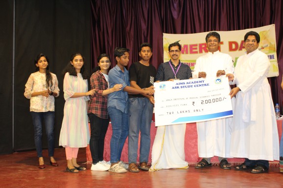 അമല മെഡിക്കല് കോളേജില് സൗജന്യ ഡയാലിസിസ് നടത്തുന്നതിന് വേണ്ടി എയിംസ് അക്കാദമിയും ആസ്ക് സ്റ്റ്ഡി സെന്ററും ചേര്ന്ന് 2 ലക്ഷം രൂപയുടെ ധനസഹായം നല്കി. മെറിറ്റ് ഡേയുടെ ഭാഗമായി നടത്തിയ യോഗത്തില് പ്രിന്സിപ്പള് ജോബി ജോസ് അമല ഡയറക്ടര് ഫാ.ജൂലിയസ് അറയ്ക്കലിന് തുക കൈമാറി. സംരംഭകയും അവാര്ഡ് ജേതാവുമായ ഗീത സലീഷ് മുഖ്യാതിഥിയായിരുന്നു. ജനറല് കണ്വീനര് ആല്വിന് തോമസ്, കോ-ഓര്ഡിനേറ്റര് വിനീഷ് വിജയന്, സ്റ്റാഫ് സെക്രട്ടറി എം.ടി സനിത, അമല അസോസിയേറ്റ് ഡയറക്ടര് ഫാ.ഷിബു പുത്തന്പുരയ്ക്കല്, വൈസ് പ്രിന്സിപ്പള് ഡോ.ദീപ്തി രാമകൃഷ്ണന് എന്നിവര് പ്രസംഗിച്ചു.