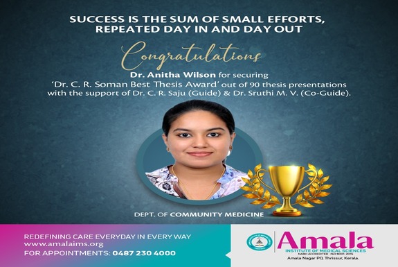 കേരളത്തിലെ മെഡിക്കല് കോളേജുകളിലെ ഏറ്റവും നല്ല പി.ജി. ഡെസര്ട്ടേഷനുള്ള അവാര്ഡ് അമല കമ്മ്യൂണിറ്റി മെഡിസിനിലെ ഡോ.അനിത വില്സന് ലഭിച്ചു. 25000/ രൂപയും പ്രശസ്തിപത്രവുമാണ് അവാര്ഡ്. 90ല്പരം ശാസ്ത്രപ്രബന്ധങ്ങളില് നിന്നാണ് ഏറ്റവും നല്ല തീസിസ് തിരഞ്ഞെടുത്തത്. അമലയിലെ തന്നെ ഡോ.മീര വര്ഗ്ഗീസിനാണ് രണ്ടാം സ്ഥാനം.